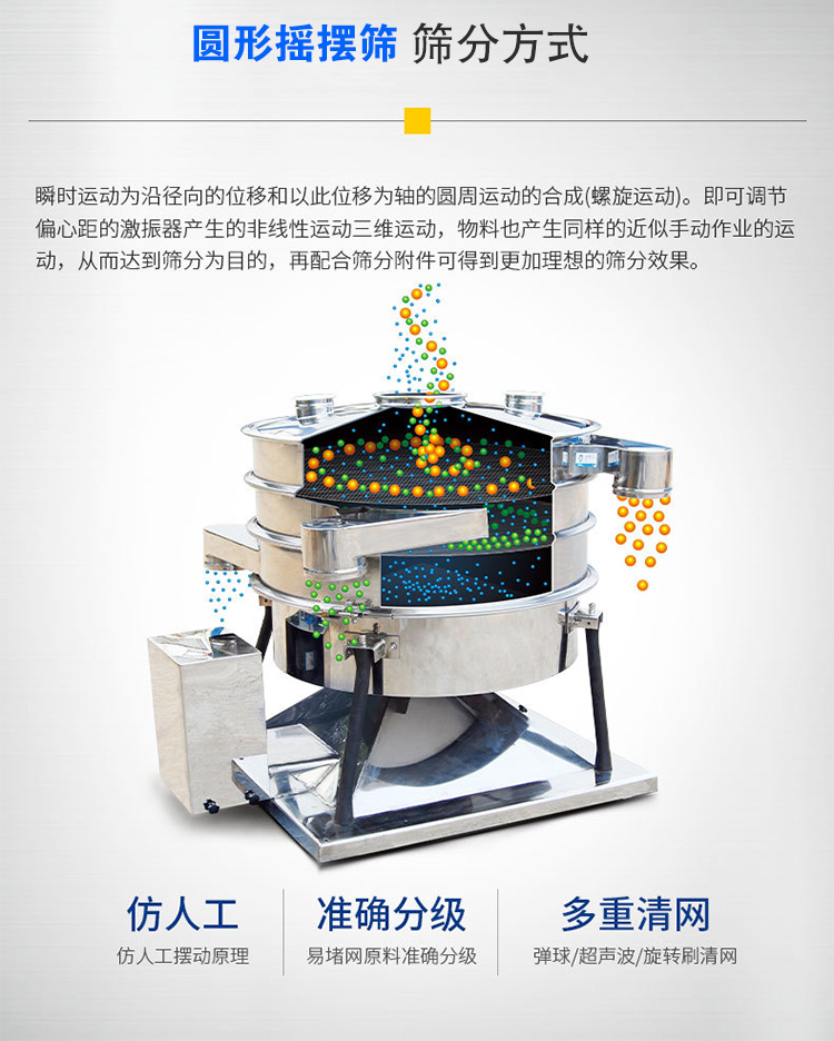 不鏽鋼搖擺篩基本的回轉運動模仿人工篩分動作。偏心率從25到40mm可調,搖擺頻率從120到360rpm可調,當接通電源後,其篩箱在振動裝置的驅動下作近似圓周運動,此時篩箱帶動整個篩麵做周期性運動,篩麵上的物料隨著篩箱在篩網上做定向跳躍式運動,在此過程中,小於篩網孔徑的物料落到篩網下層,從下出料口排出,大於篩網孔徑的物料從上出料口排出,中間層則從中出料口排出,以此來完成整個篩分工作。